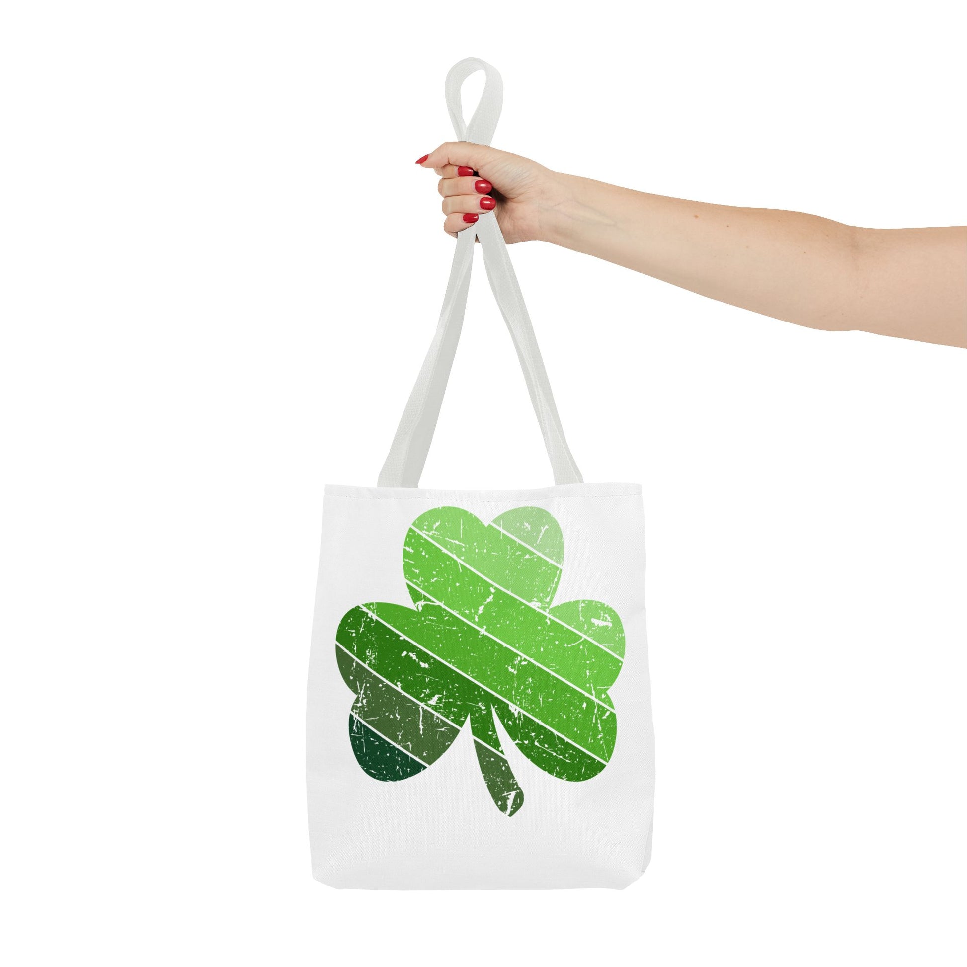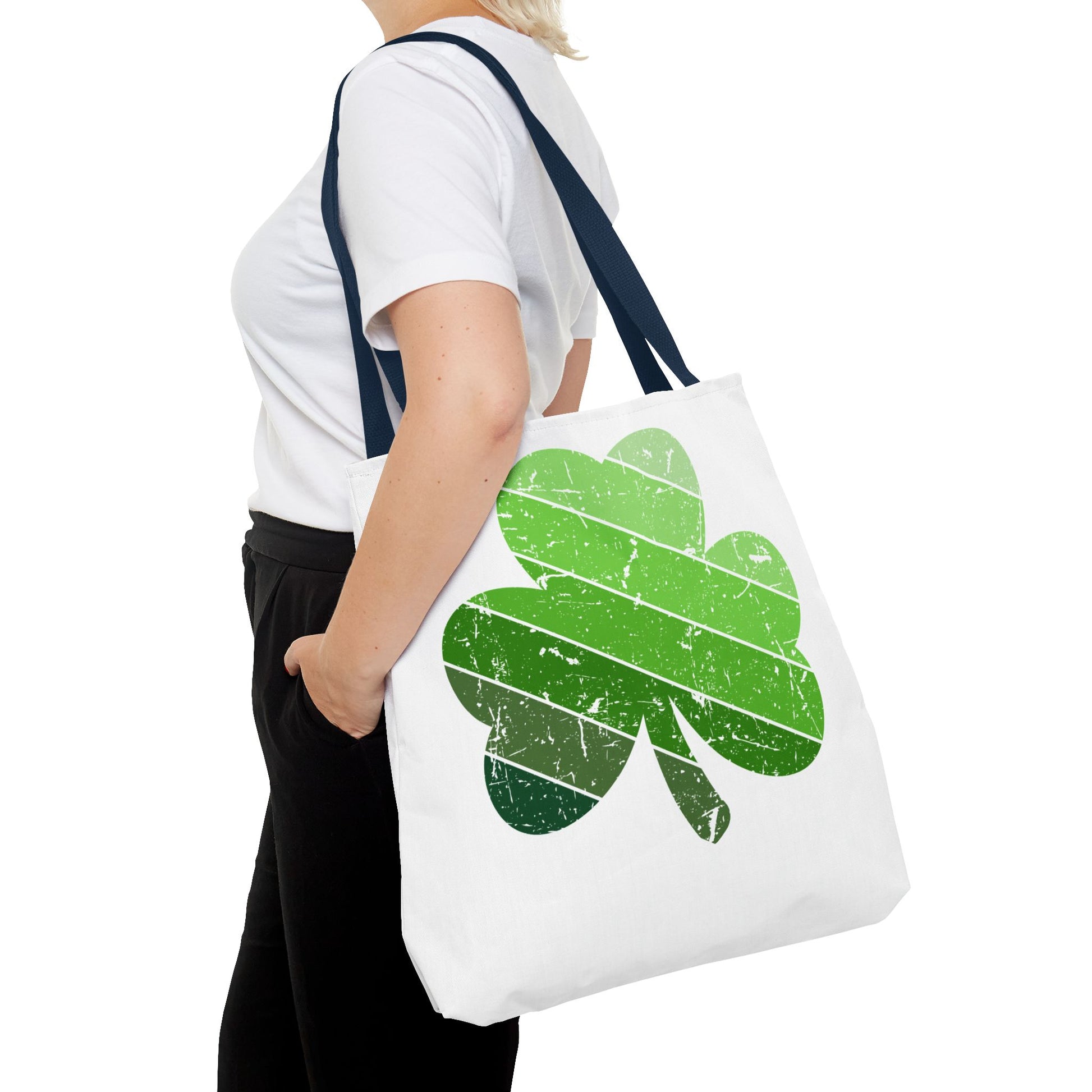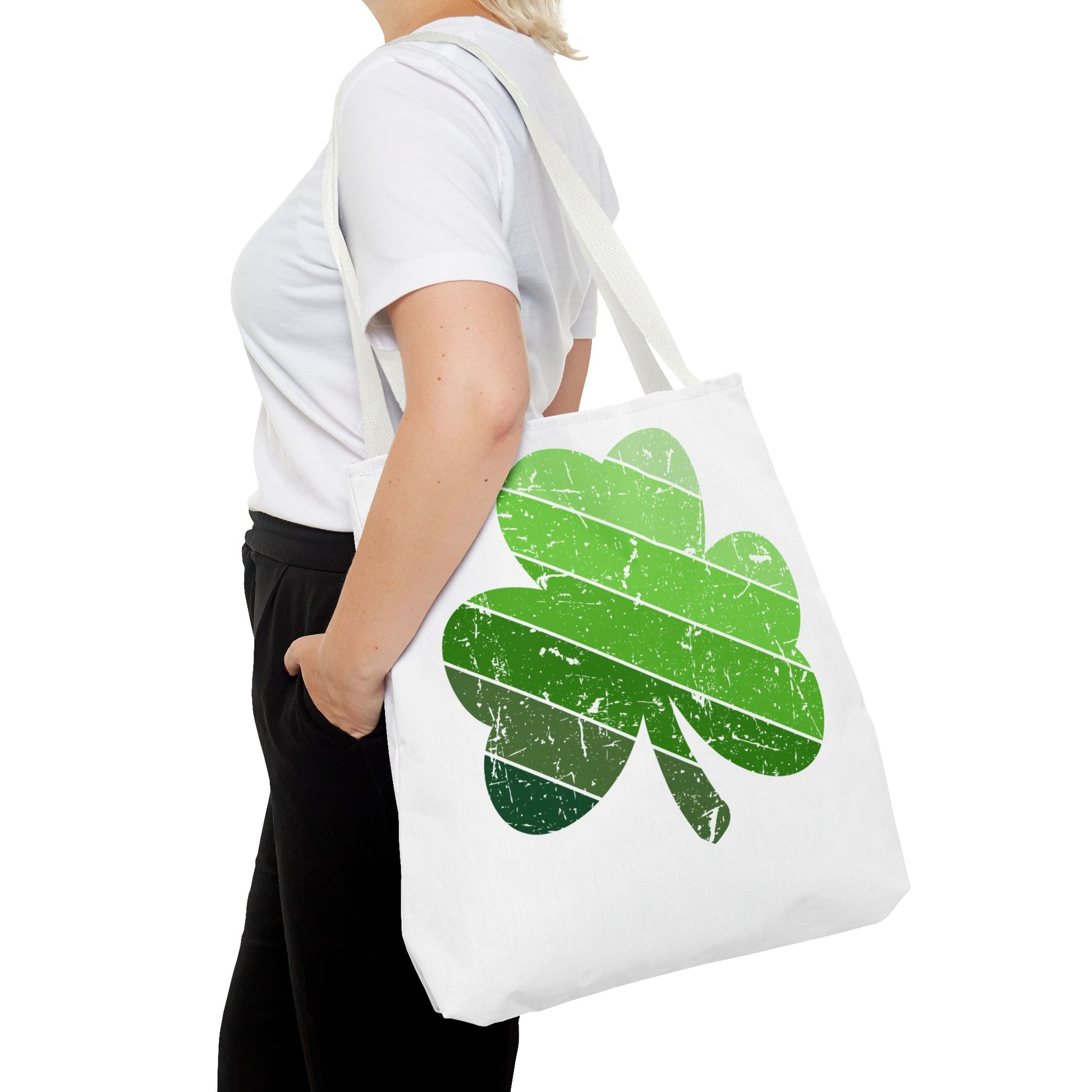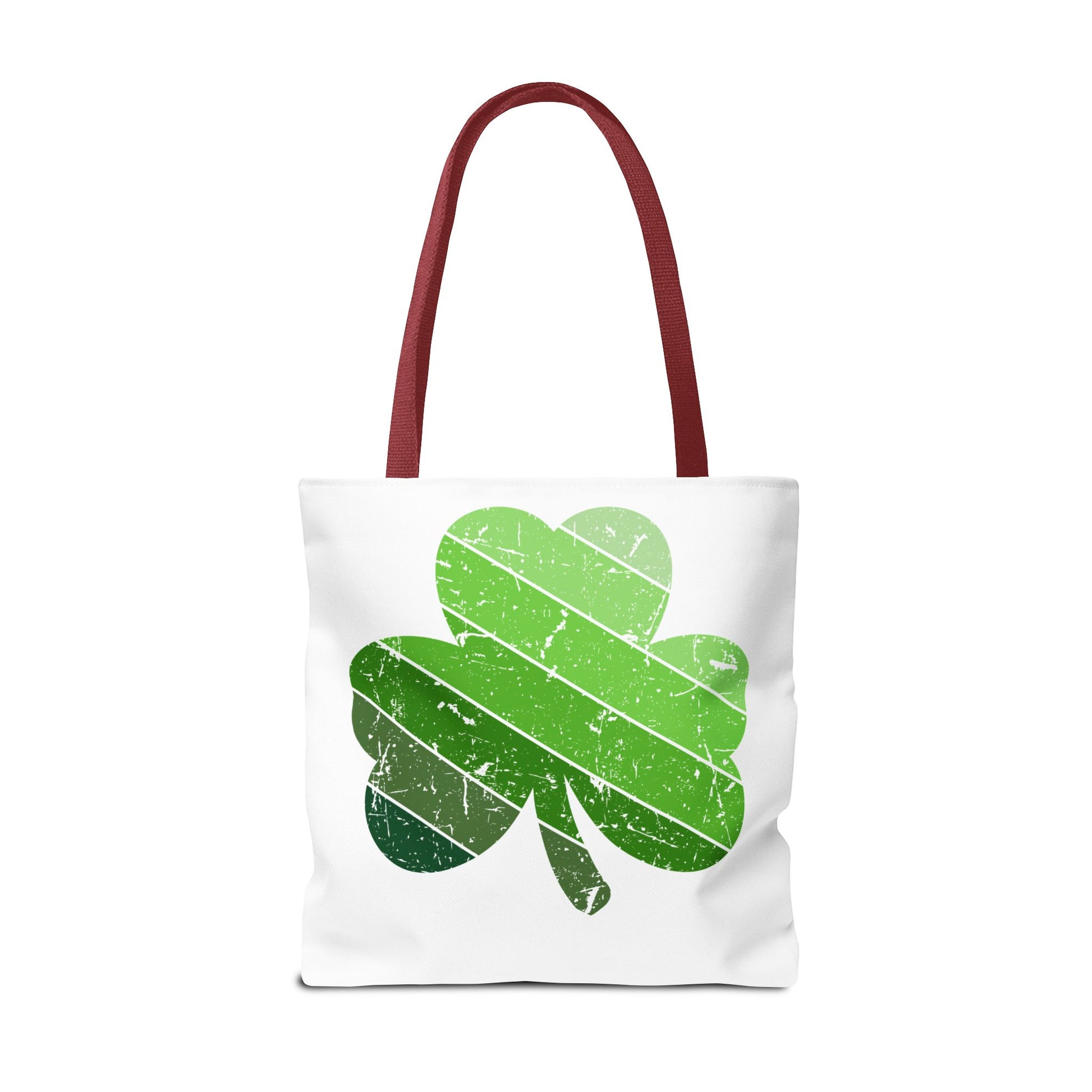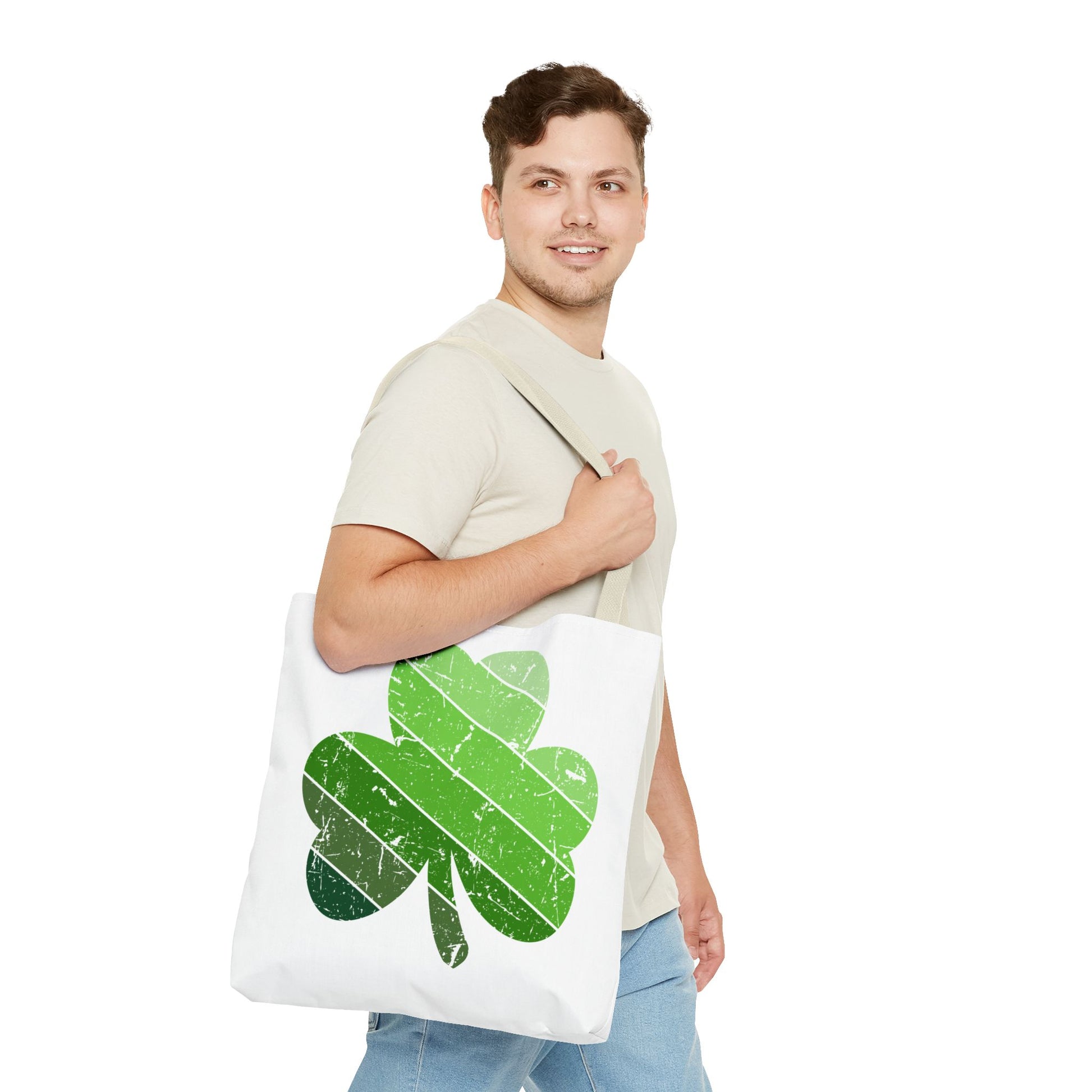 Lightweight, durable, and cheerfully green — this tote brings a playful, weathered shamrock to everyday routines. The soft, all-over print sits on a sturdy polyester body with boxed corners for extra space, while reinforced handles and a laminated interior keep your day-to-day carried with confidence. It slips into market runs, library stops, and festival walks without weighing you down. The sun-faded stripes across the clover add a lived-in, vintage vibe that pairs beautifully with casual layers and weekend plans.