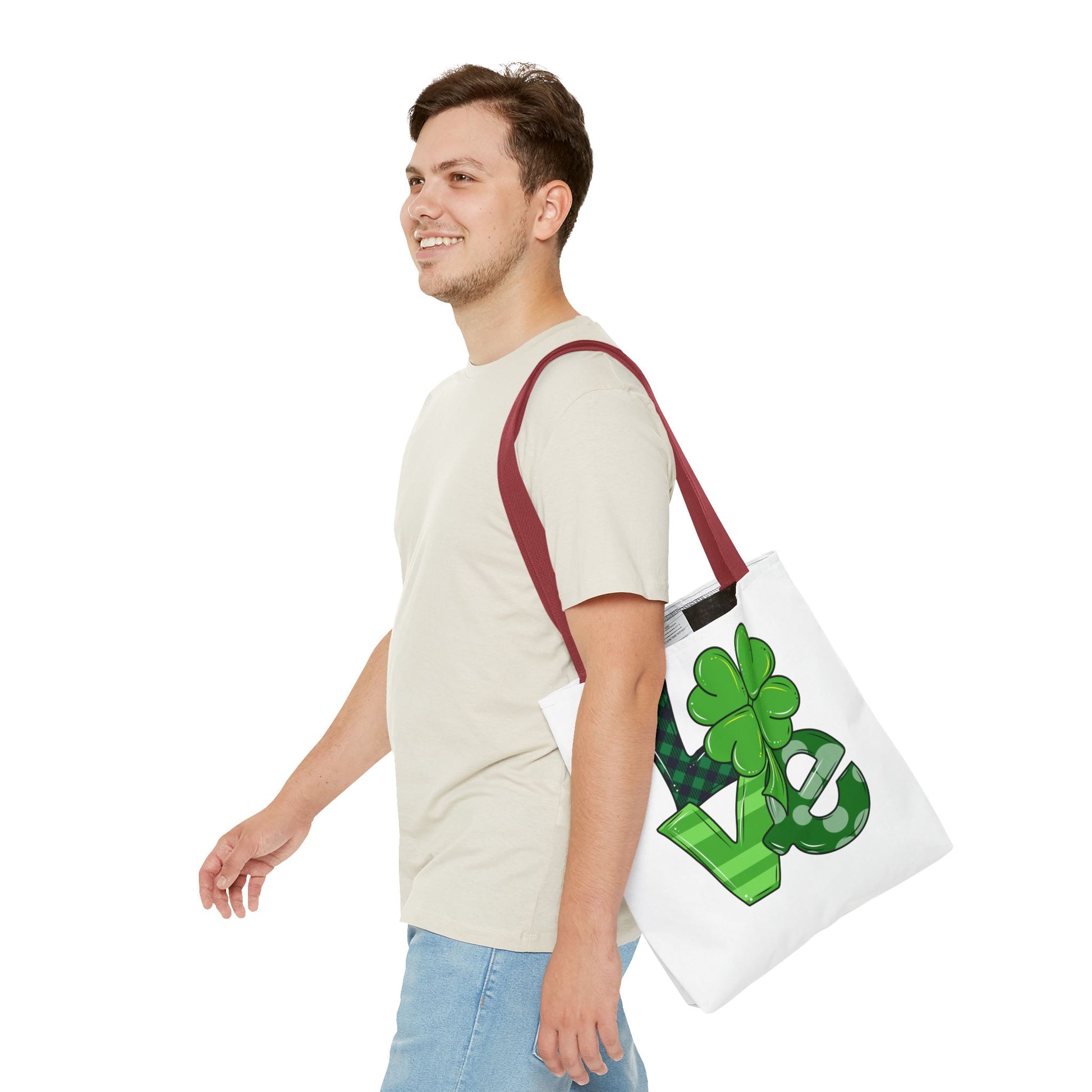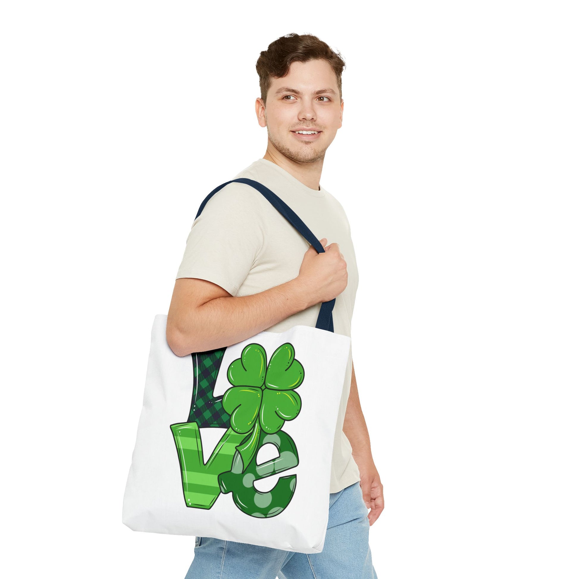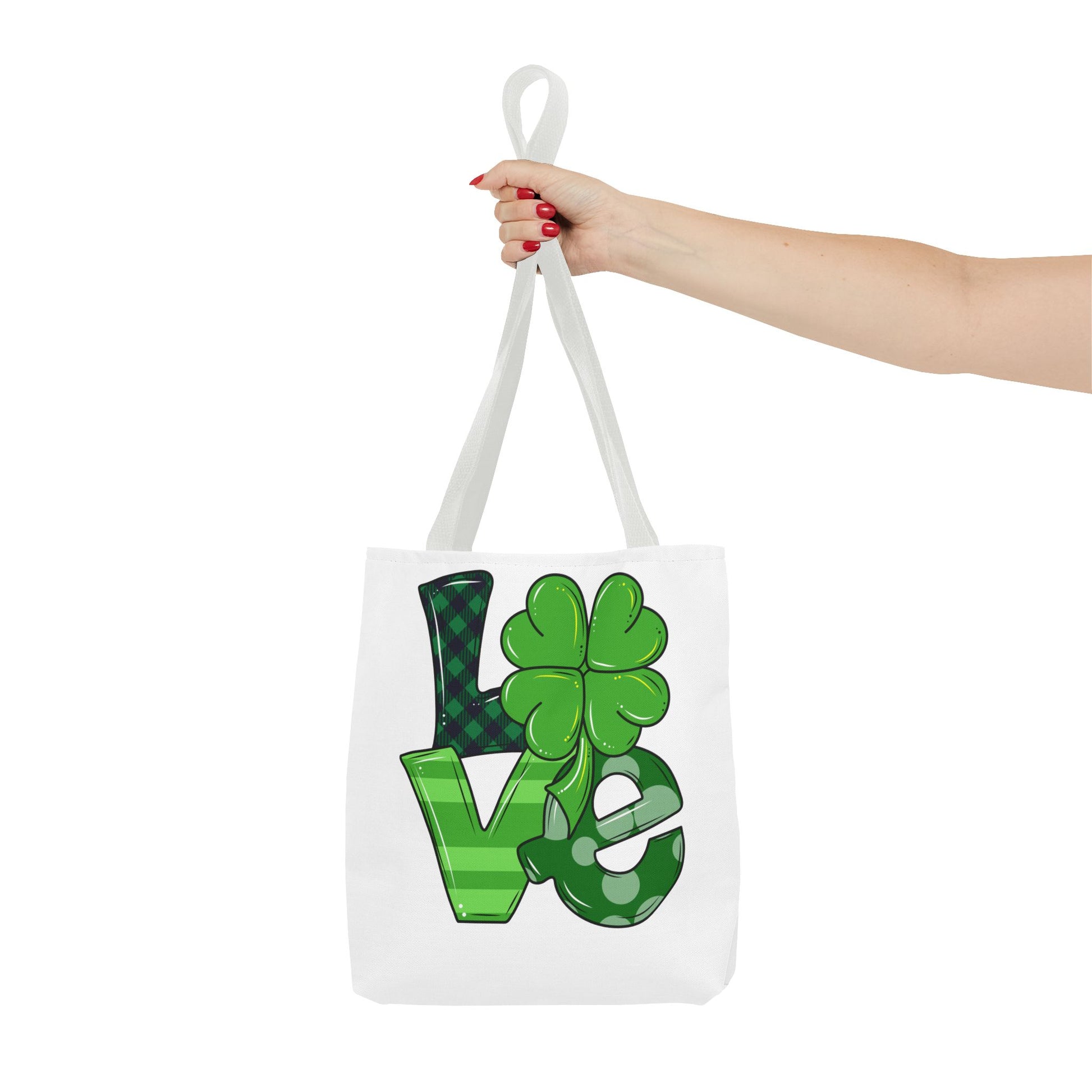 Carry a little luck wherever you go with this cheerful, all-over-print tote. Bright green lettering and a playful four-leaf clover pop against a clean white background, giving the bag an upbeat, festive feel. Lightweight but sturdy polyester holds its shape and resists moisture, while boxed corners and reinforced handle stitching create real everyday room and strength for groceries, books, or market finds. Choose a handle color and size that fits your routine — this tote slips into commutes, weekend markets, and springtime celebrations with easy, confident charm.
